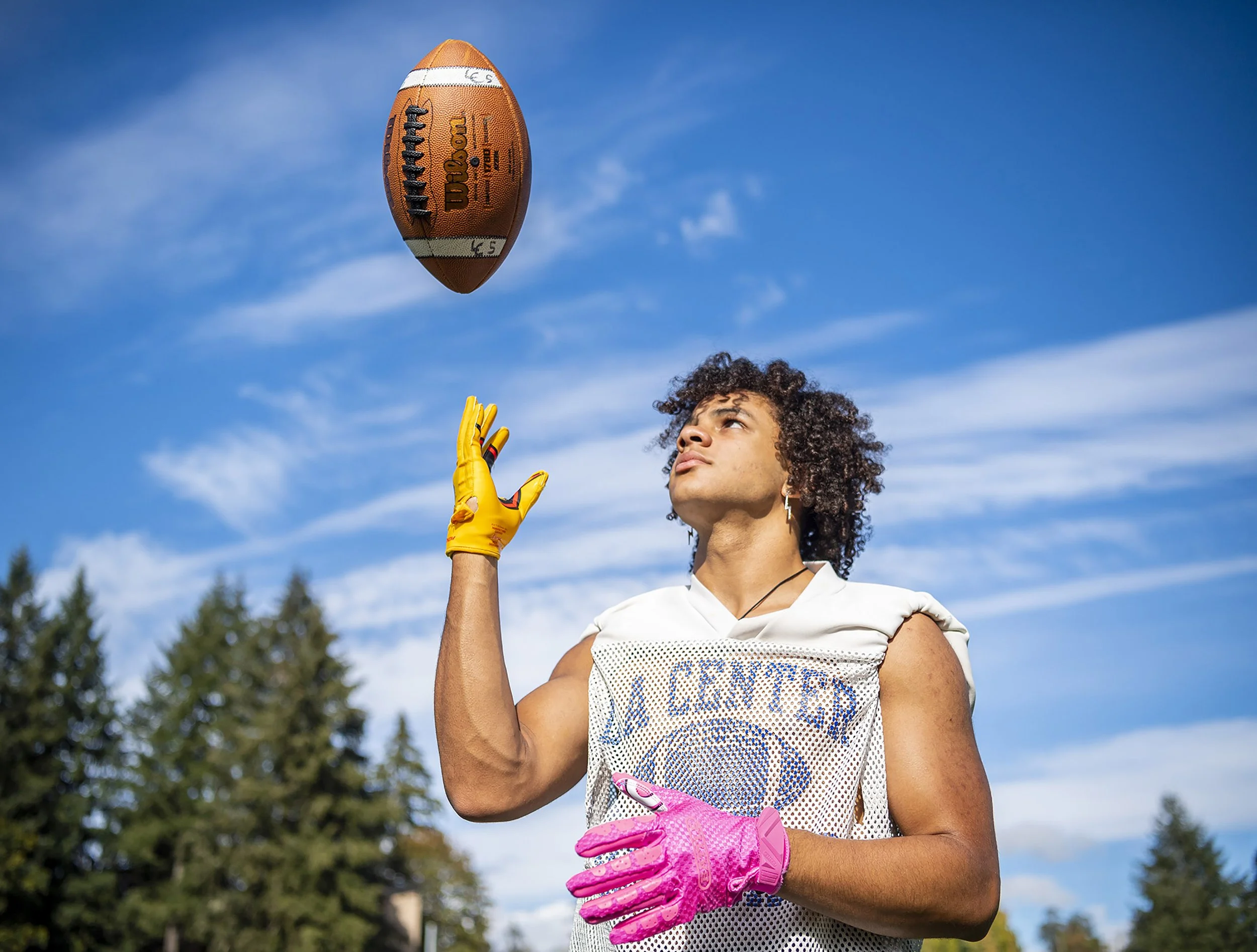 La Center senior receiver Davari Grauer shows off his bright gloves for a portrait Wednesday, Sept. 28, 2022, at La Center High School in La Center, Wash. Grauer wears the gloves for his grandfather, who has Alzheimer’s, so that his grandfather can find him on the field when he forgets what number he wears.